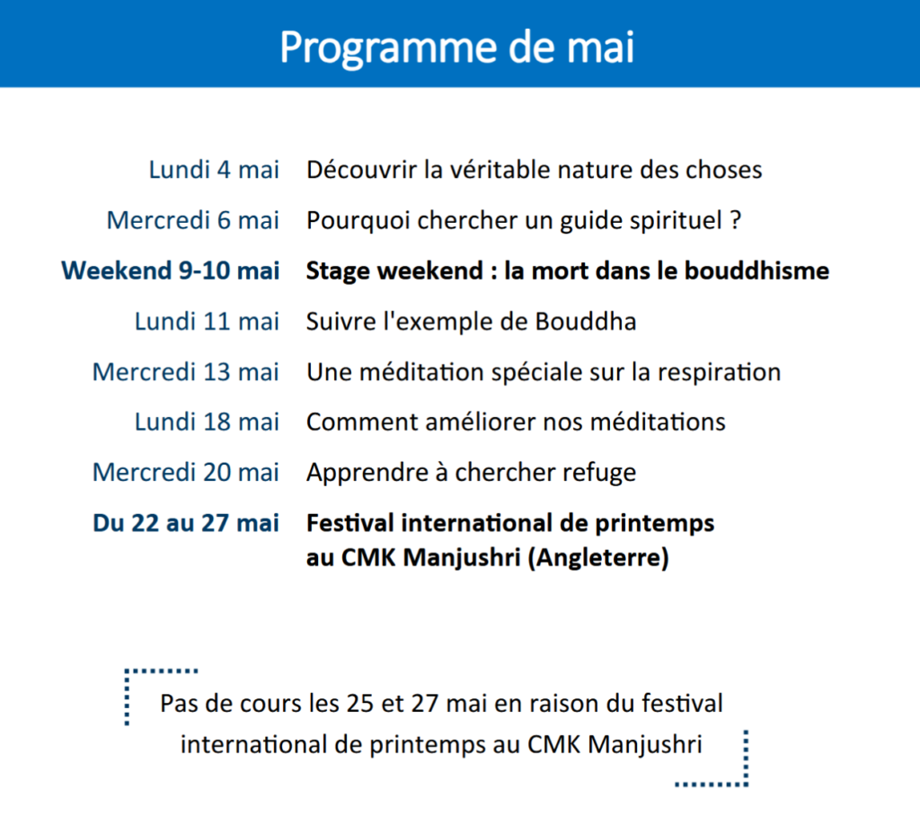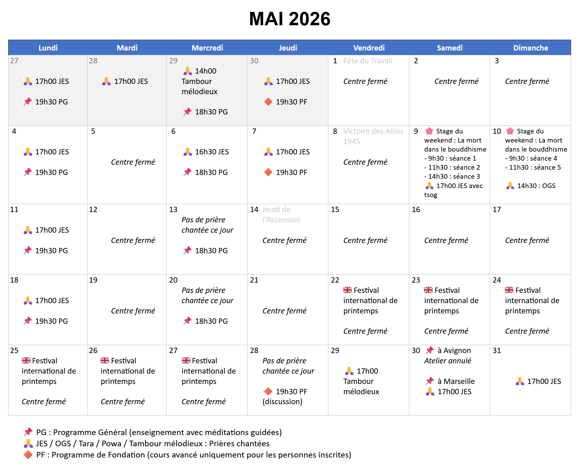 PG : Programme Général (séance avec enseignement et méditation guidée)