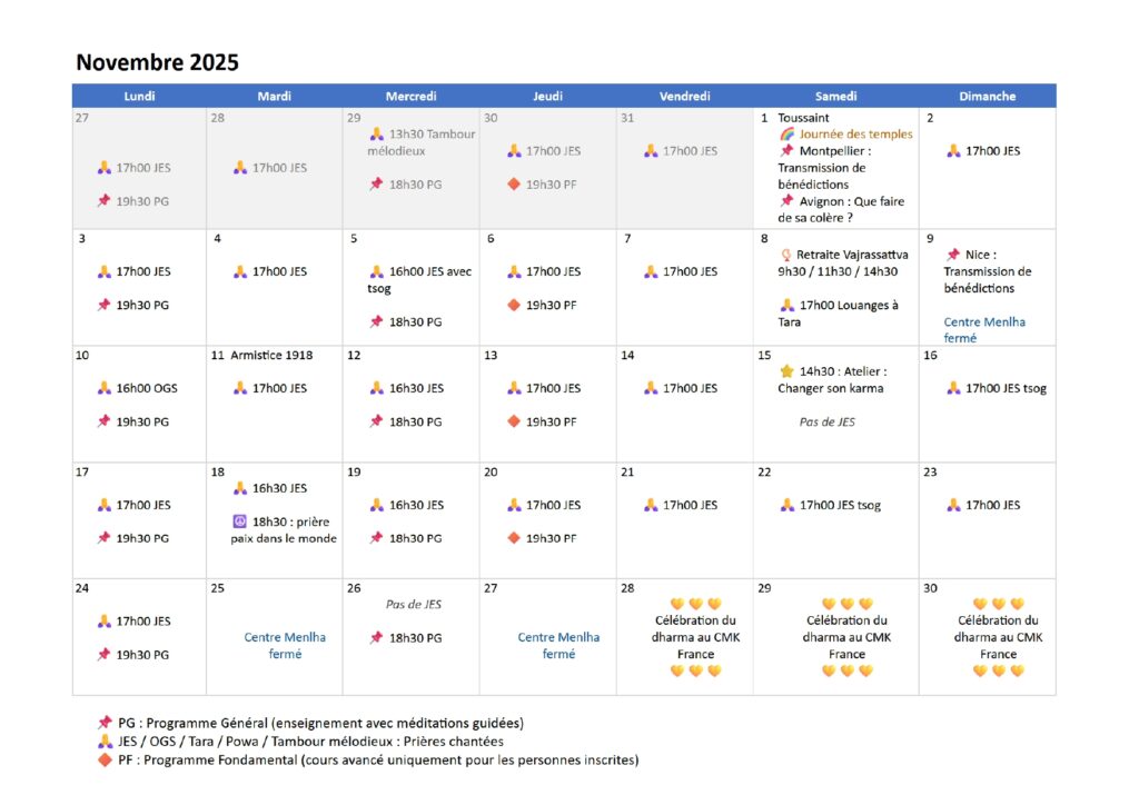 PG : Programme Général (séance avec enseignement et méditation guidée)