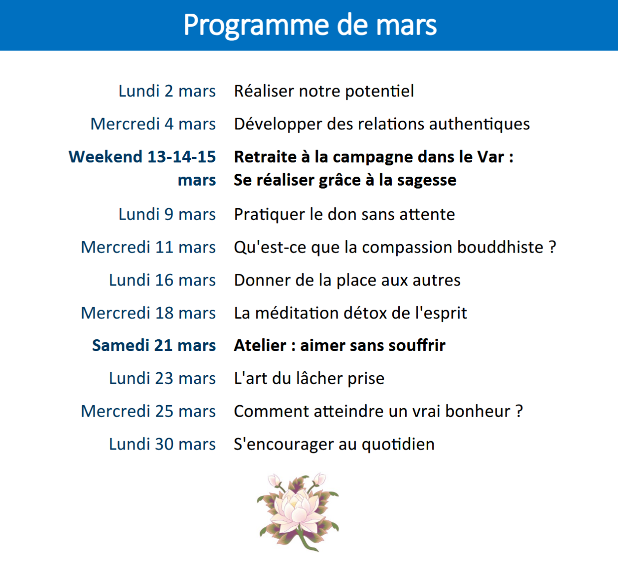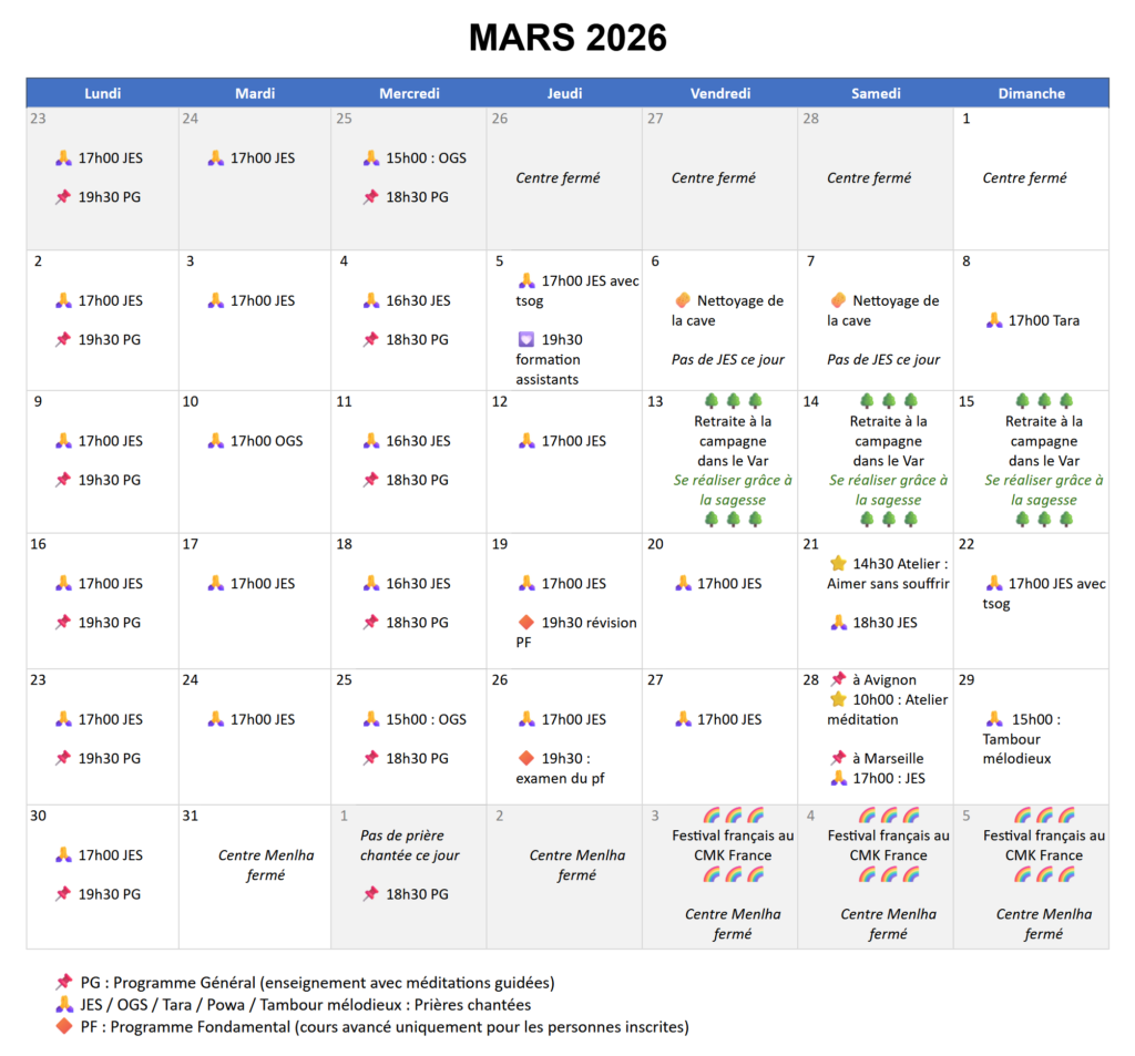 PG : Programme Général (séance avec enseignement et méditation guidée)