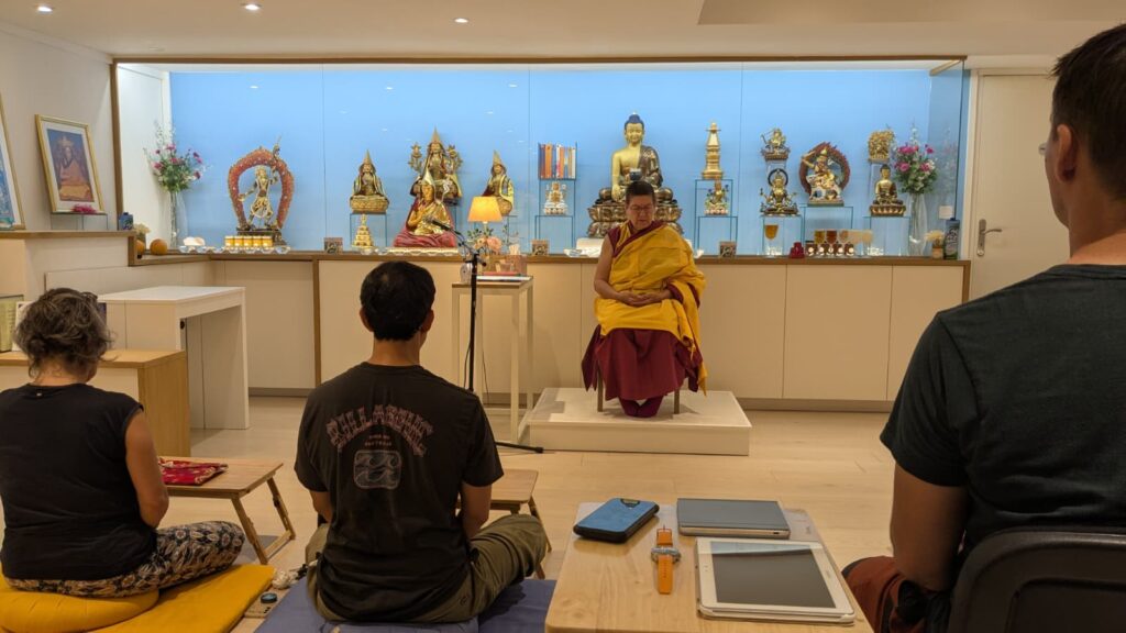 Il n’est pas possible d’accéder à la salle de méditation en fauteuil, cependant, nous disposons d’un système de retransmission vidéo dédié à l’accueil des personnes à mobilité réduite, qui permet de suivre les enseignements au rez-de-chaussé.